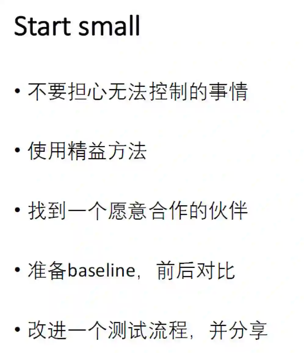另外一个值得关注的点是我们要梳理好基线,方便我们后期做出变革后进行前后对比,这样才好度量进步了多少。最后是改进一个测试的流程,并且分享和影响他人。
