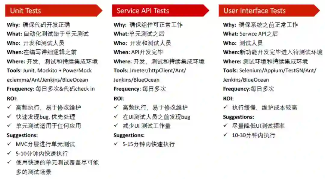 对于分层测试,这里列了为什么执行测试?由谁执行,以及测试的工具有哪些,还有频率,投资回报率等。