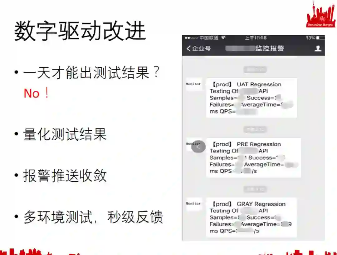 那么,这个时候如果你采用自动化测试,并且快速的量化测试结果,其实可以达到秒级响应。这里的例子是把测试结果推送给微信。上面显示的是凌晨两三点执行的测试结果。