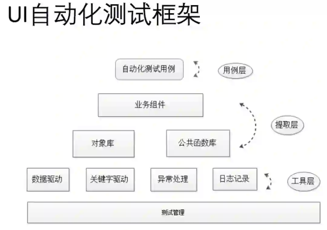 最后是UI的测试框架。这里只是简单提供给大家参考,分为用例层、提取层和工具层。为什么会有这么一个框架的存在?