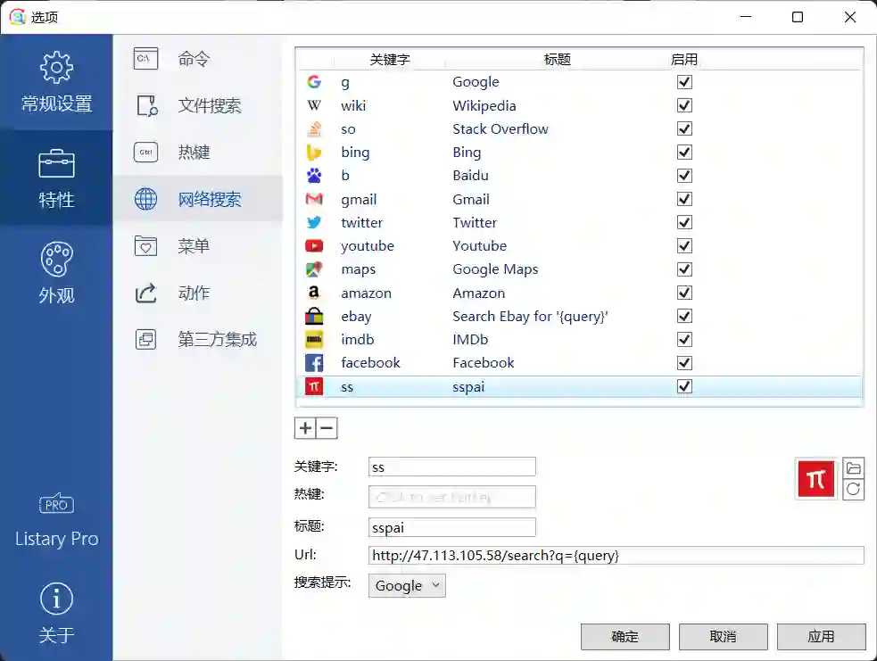 而 Listary 的网络搜索和自动定位则是让我放弃使用 PowerToys Run 的「罪魁祸首」。相较于 PowerToys Run 只能使用 Bing 进行搜索,Listary 提供了许多网络搜索选项,你可以使用关键字触发网络搜索,且会提供搜索建议。如果内置的网络搜索仍然不能满足你的需求,你也可以添加自定义搜索。例如,我就添加了由会员派友制作的少数派搜索。