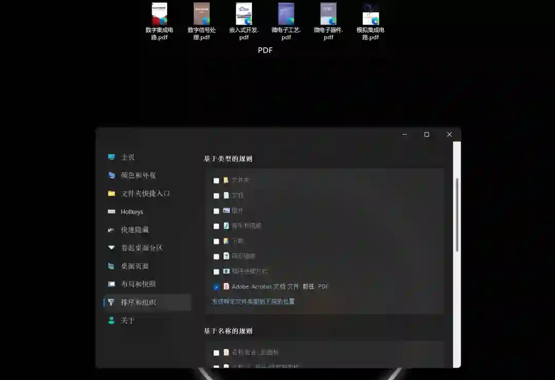 只需要在 Fences 的「排序与组织」中添加相应规则,Fences 便会将你扔到桌面的文件自动放入对应的分区。例如,我设置了将 .pdf 文件归入 PDF 分区,我只需要将常用的电子教材拖动到桌面,Fences 便会将它们整齐的排列在分区中,方便查找。