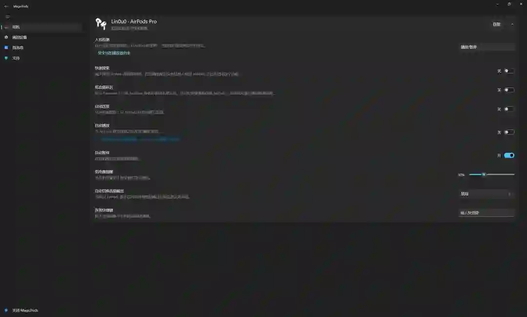 MagicPods 还为 Windows 用户补全了入耳检测的拼图。在入耳检测选项中选择「播放/暂停」即可在摘下一支耳机时自动暂停音乐播放,如果摘下了两支耳机,播放会被停止,再次带上耳机也不会继续播放。除了「播放/暂停」外,MagicPods 还提供了「降低音量」选项,在摘下耳机与他人沟通时,可以不打断媒体的播放,也不被媒体影响听力。