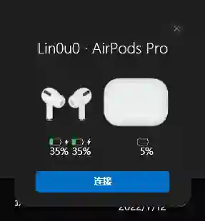 当 AirPods 的耳机盒被打开时,Windows 设备也可以拥有和 iOS 设备一致的弹窗体验,直观地展示了当前设备的电池电量。你可以点击「连接」按钮连接设备,或者使用自定义的键盘快捷键连接设备。