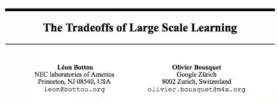 这篇论文主要提出了一种理论框架,来衡量机器学习中近似最优化方法的效果。分析结论发现,对于小规模数据和大规模数据,近似最优化算法的 tradeoff 是不相同的。