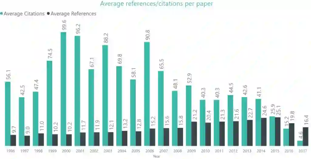 在下图中,黑色条形代表了每年论文的平均参考文献数量,从数据中可以看出,参考文献数量呈增长趋势;绿色条形代表了每年论文被引用的平均次数: