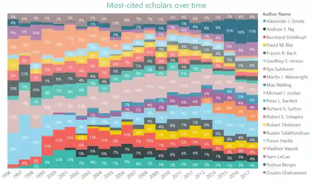 下面100%堆叠的条形图显示了前20位学者每年的NeurIPS被引用的情况。