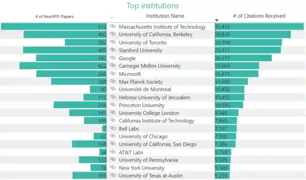 下面的气泡图通过NeurIPS论文中的引用计数,来可视化NeurIPS的顶级学术机构排名。