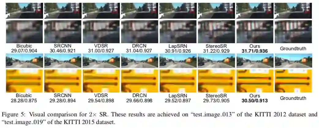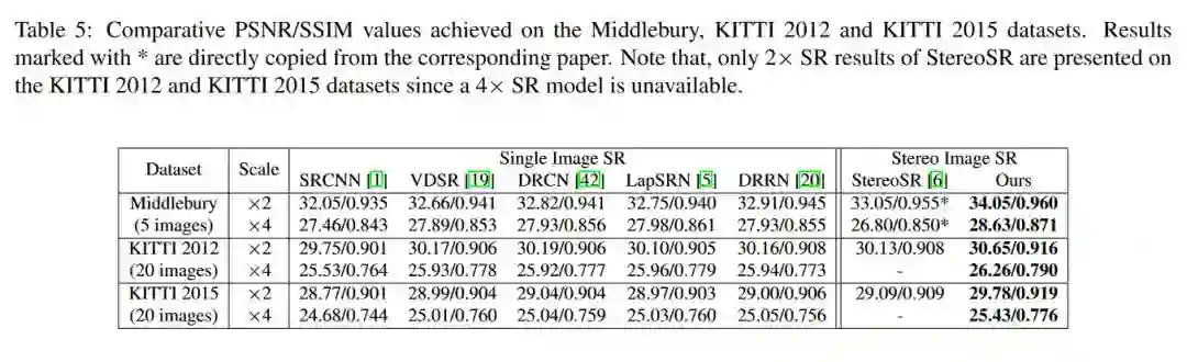 本文在Middlebury, KITTI2012以及KITTI2015三个公开数据集上将PASSRnet与双目超分辨算法StereoSR(CVPR18),单图超分辨算法SRCNN(ECCV14)、VDSR(CVPR16)、DRCN(CVPR16)、LapSRN(CVPR17)以及DRRN(CVPR17)进行了对比,结果如下表所示: