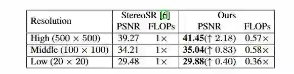 由上表可见,随着输入图像分辨率的增加,双目图像间的视差不断增大,PASSRnet相比于StereoSR的优势不断增强,这主要是因为StereoSR算法无法对视差超过64像素的图像信息进行融合,而PASSRnet采用了视差注意力机制,可以对双目图像全局信息进行有效融合;