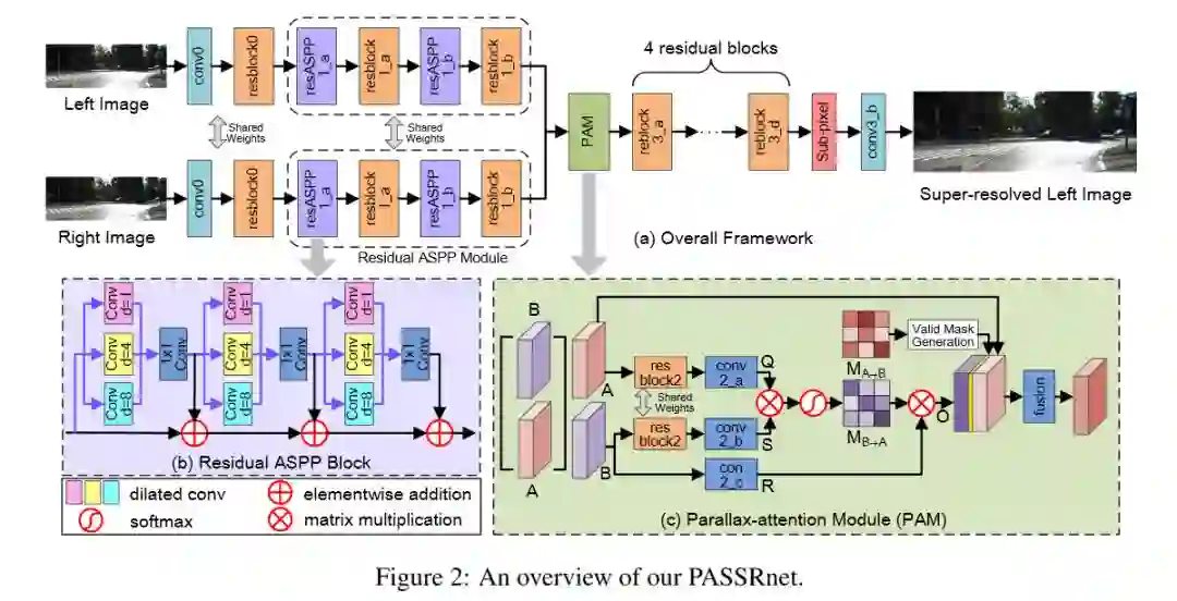 本文提出了一种基于视差注意力机制(Parallax Attention Mechanism)的双目图像超分辨网络(Parallax Attention Stereo SR Network, PASSRnet),利用视差注意力机制实现了对双目图像左右图信息的高效融合。