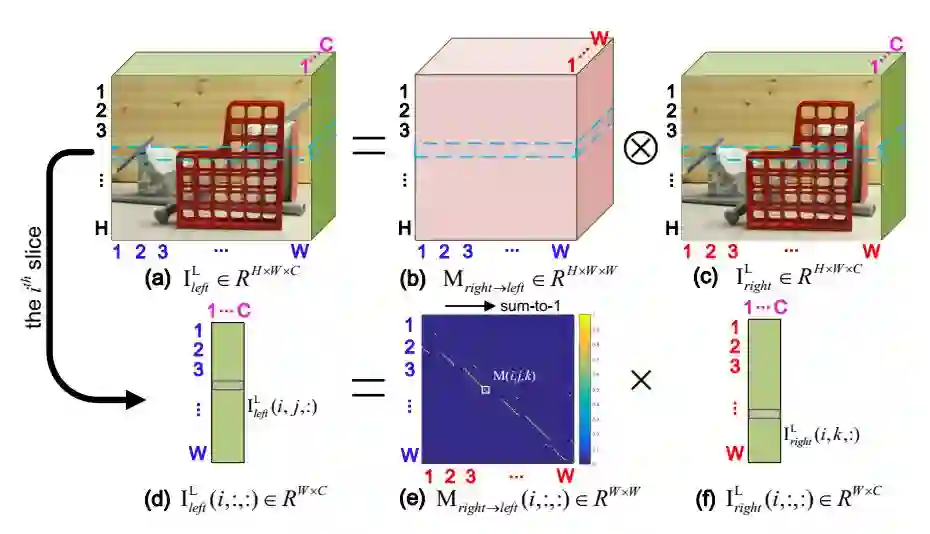 比如视差注意力图与右图的批次化矩阵乘可以得到左图,反之亦然。