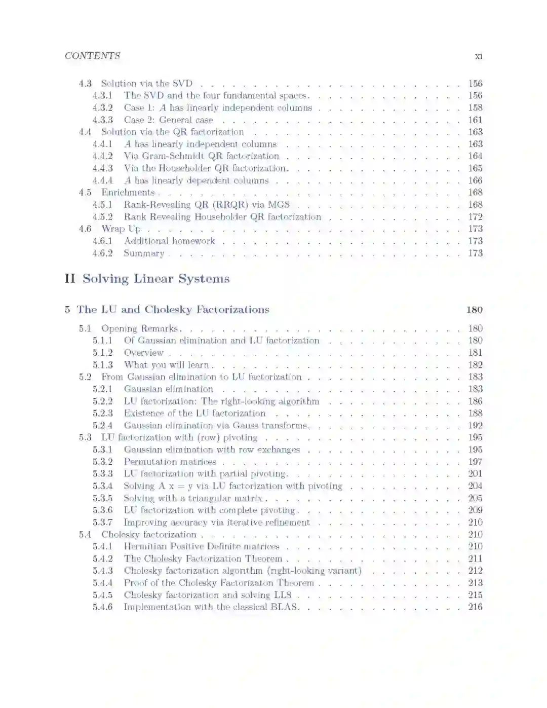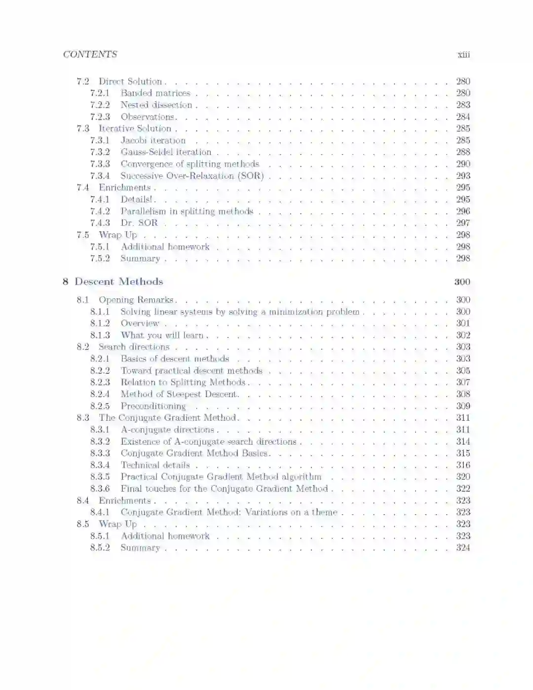第二部分:求解线性系统集中在所谓的直接和迭代方法,同时也引入了数值稳定性的概念,它量化和限定了在问题的原始陈述中引入的误差和/或在计算机算法中发生的舍入如何影响计算的正确性。