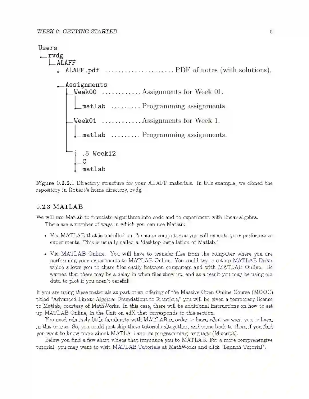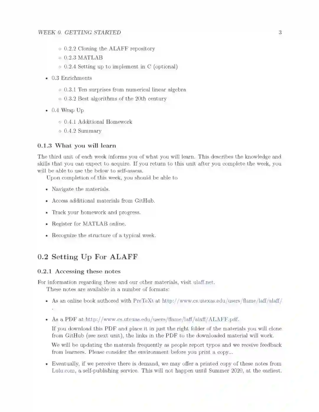 我们在不同的设置中使用了这些材料。这是我们在德克萨斯大学奥斯汀分校名为“数值分析:线性代数”的课程的主要资源,该课程由计算机科学、数学、统计和数据科学、机械工程以及计算科学、工程和数学研究生课程提供。这门课程也通过UT-Austin计算机科学硕士在线课程提供“高级线性代数计算”。最后,它是edX平台上名为“高级线性代数:基础到前沿”的大规模在线开放课程(MOOC)的基础。我们希望其他人可以将ALAFF材料重新用于其他学习设置,无论是整体还是部分。