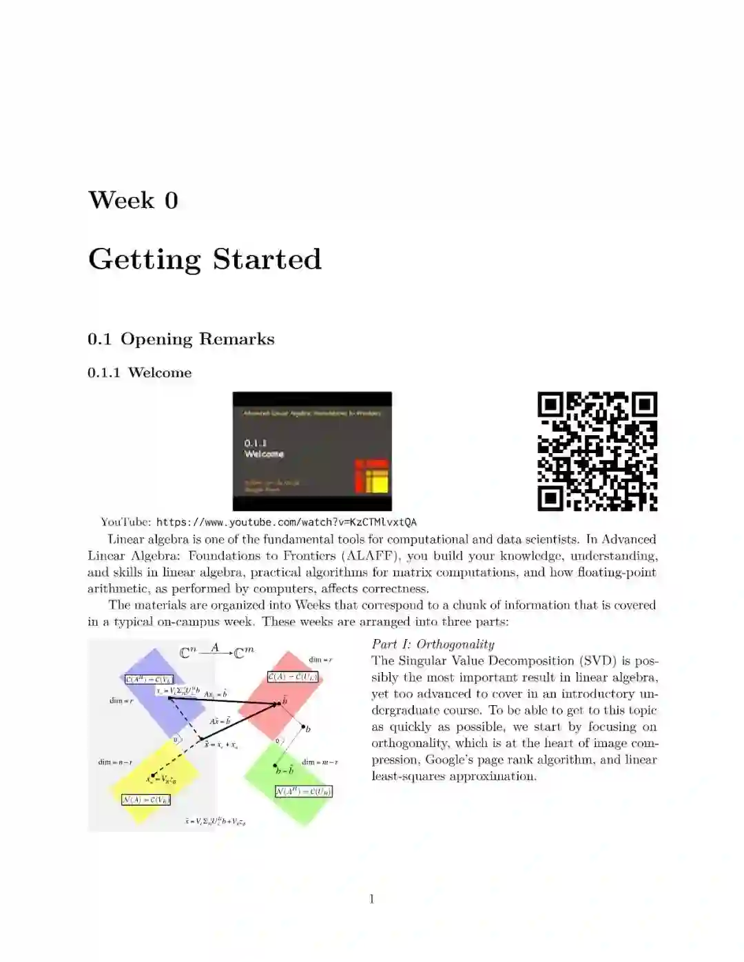 线性代数是计算和数据科学家的基本工具之一。这本书“高级线性代数:基础到前沿”(ALAFF)是一个替代传统高级线性代数的计算研究生课程。重点是数值线性代数,研究理论、算法和计算机算法如何相互作用。这些材料通过将文本、视频、练习和编程交织在一起来保持学习者的参与性。