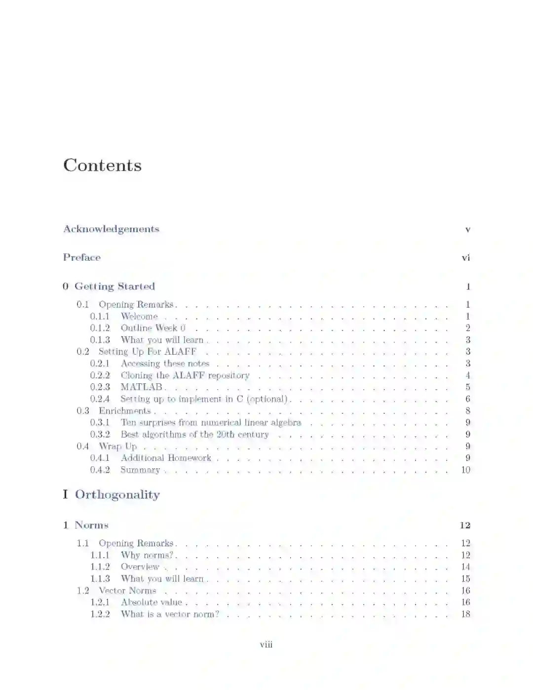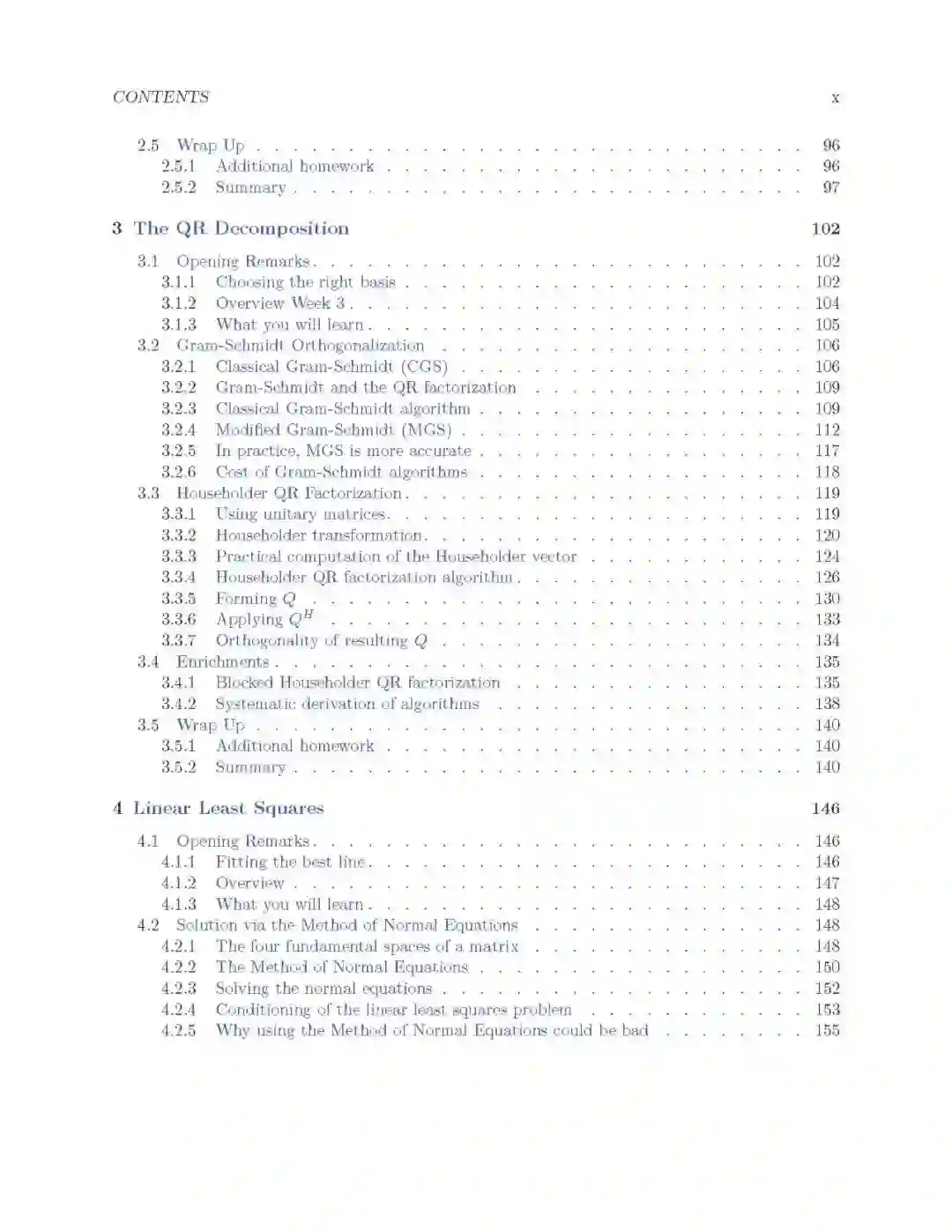 第一部分:正交性探讨了正交性(包括规范的处理、正交空间、奇异值分解(SVD)和解决线性最小二乘问题)。我们从这些主题开始,因为它们是其他课程的先决知识,学生们经常与高等线性代数并行(甚至在此之前)进行学习。