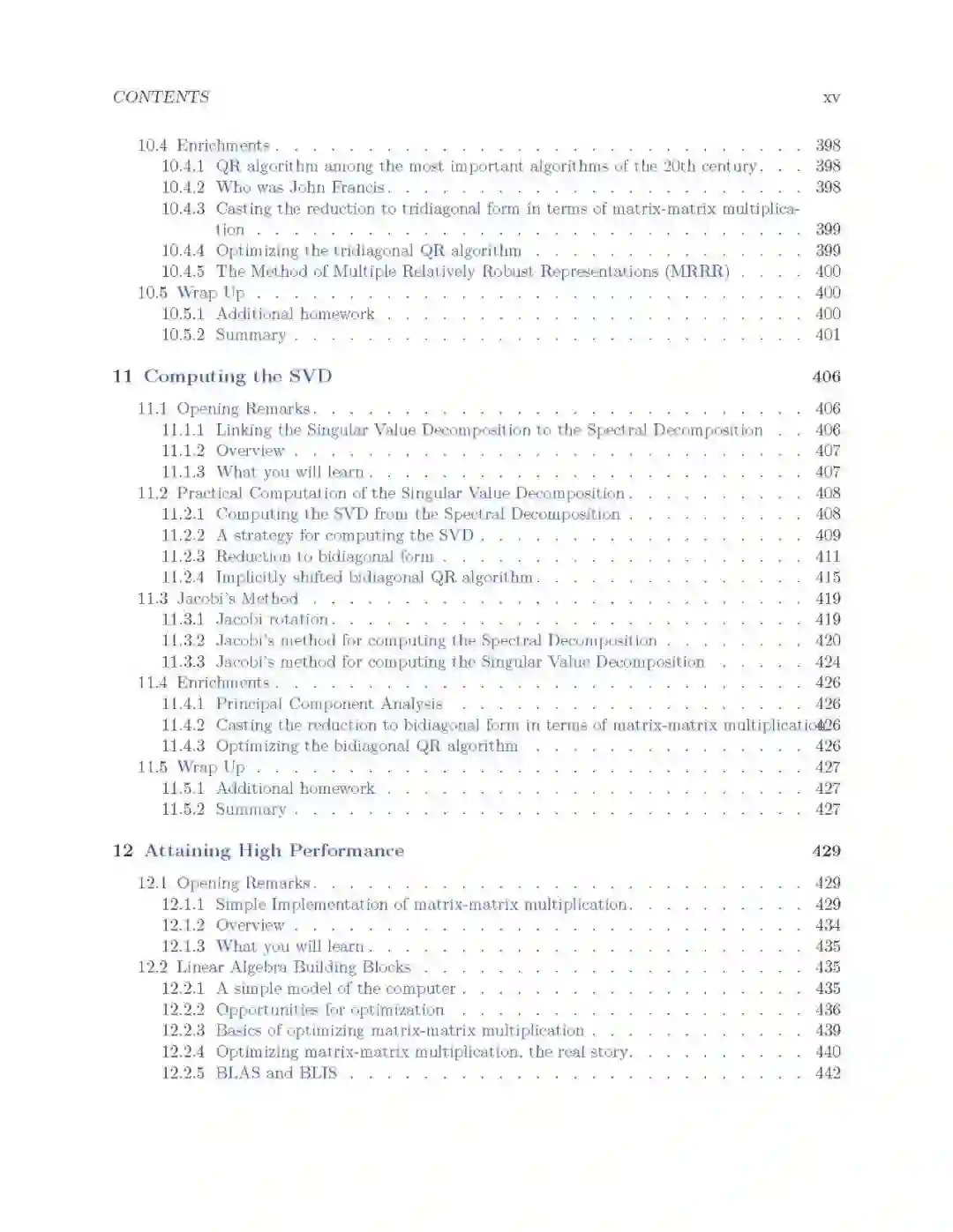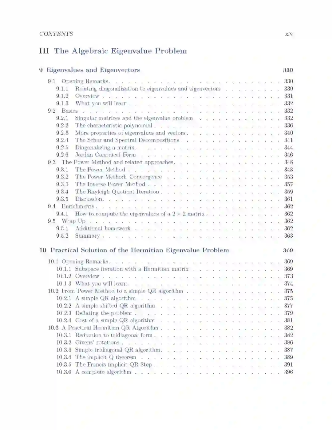 第三部分:代数特征值问题,重点是计算矩阵的特征值和特征向量的理论和实践。这和对角化矩阵是密切相关的。推广了求解特征值问题的实用算法,使其可以用于奇异值分解的计算。本部分和本课程以在现代计算机上执行矩阵计算时如何实现高性能的讨论结束。