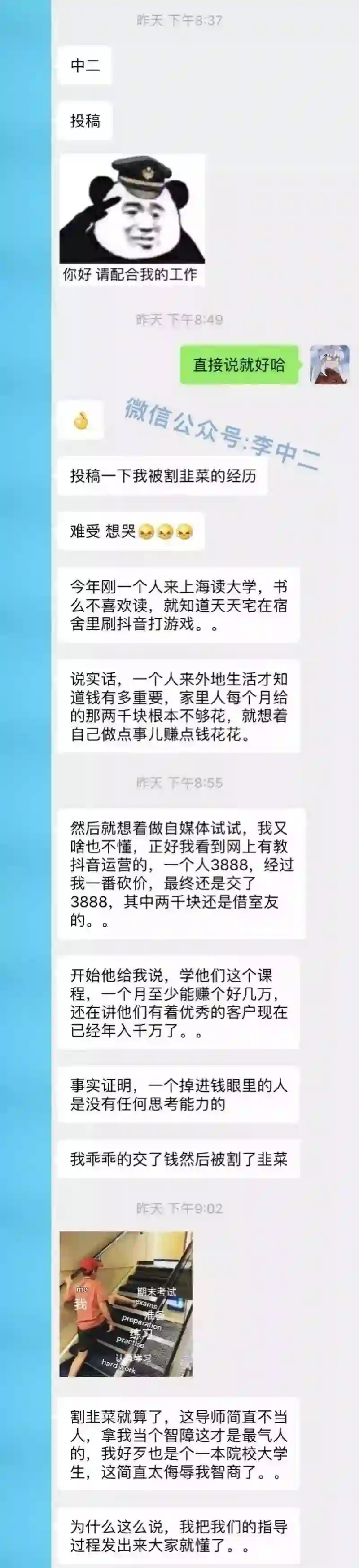 正好今天蹭流量的还有一篇稿子,不过是一周前发的:《交了3800学抖音运营被疯狂嘲讽:你是个合格的韭菜》。一位充满了热情的新媒体运营爱好者想学习成为抖音网红的技巧,于是找上了一家骗子公司,交了3800,结果别人告诉他,你就是个韭菜。截图如下。