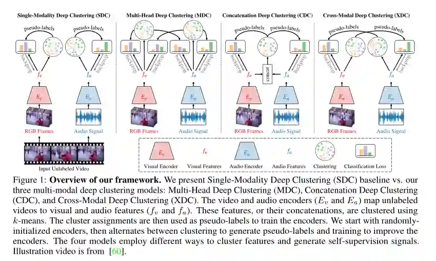 摘要:视觉和音频模态高度相关,但是它们包含不同的信息。它们之间的强相关性使得可以高精度地预测彼此的语义。与在模态内学习相比,它们的固有差异使跨模态预测成为视频和音频表示形式的自监督学习的潜在更有意义的任务。基于这种直觉,我们提出了跨模态深度聚类(Cross-Modal Deep Clustering,XDC),这是一种新颖的自监督方法,它利用一种模态(例如音频)中的无监督聚类作为另一种模态(例如视频)的监督信号。这种跨模态监督有助于XDC利用语义相关性和两种模态之间的差异。我们的实验表明,XDC优于单模态聚类和其他多模态变体。XDC在多种视频和音频基准测试的自监督方法中实现了最先进的准确性。最重要的是,我们针对大规模无标签数据进行预训练的视频模型明显优于针对ImageNet和Kinetics在HMDB51和UCF101上进行动作识别的预训练的相同模型。据我们所知,XDC是第一个自监督学习方法,其性能优于大规模有监督的针对相同体系结构上的动作识别的预训练模型。
