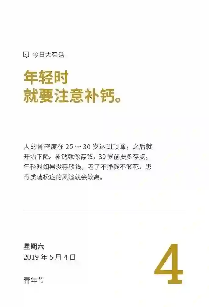 补钙像存钱,30岁前要多存,避免老了不够花。