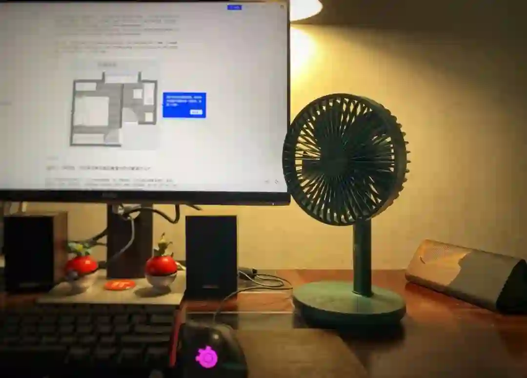 但房间里只有一台风扇的不便之处,也非常显而易见,就是我不得不把它在床边与桌边之间「辗转挪移」。要是有一个能常驻于桌边的小风扇,就可以免去这一层麻烦,让大号的风扇专心在睡眠时服侍我了。