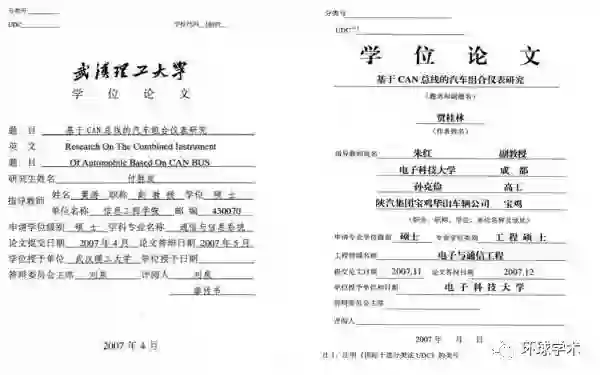 据澎湃新闻6月报道,有网友反映称,电子科技大学电子与通信工程领域2007届毕业生贾桂林2007年11月提交的硕士学位论文《基于CAN总线的汽车组合仪表研究》和武汉理工大学信息工程学院通信与信息系统专业2007届毕业生付胜波2007年4月提交的硕士学位论文《基于CAN总线的汽车组合仪表研究》两篇论文高度雷同。