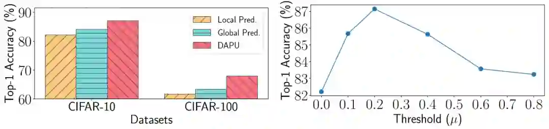 除此之外,FedU 还对比了使用不同的预测器的结果,使用发散感知的预测器更新策略(DAPU)在两个数据集上能得到最好的结果。另外,阈值