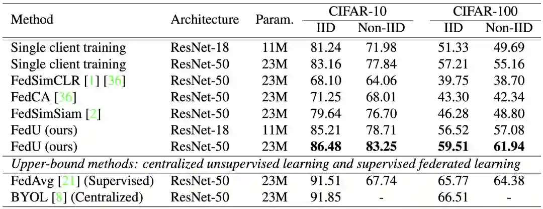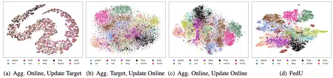 FedU 中提出应该上传并更新在线网络。首先从模型上传对于本地数据的视觉表示学习的有效性来看,在线网络的参数由于在每个训练的轮次都使用梯度下降进行更新,因此可以更好地捕获本地数据集的特征。其次,从模型更新的角度来看,在云端执行的模型融合是为了更好的泛化能力,而本地的目标网络只是提供本地数据集相关的监督信号,如果使用全局模型来更新本地的目标网络,则无法提供有效的本地数据集相关的监督信号供在线网络学习,降低了训练的效率。此外,如果同时更新本地的在线和目标网络则会导致本地模型需要去适应在异构数据上训练得到的全局模型,也会影响训练的结果。因此 FedU 中涉及的通信协议只上传并更新在线网络。