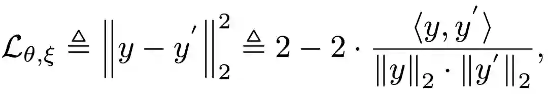 2. 将两个不同的变换分别通过在线网络和目标网络。在线网络中通过一个编码器和预测器,输出一个预测向量;目标网络通过一个编码器输出一个维度相同的向量,对比学习目标是让在线网络与目标网络的输出尽可能相近,所以对两个向量计算损失函数: