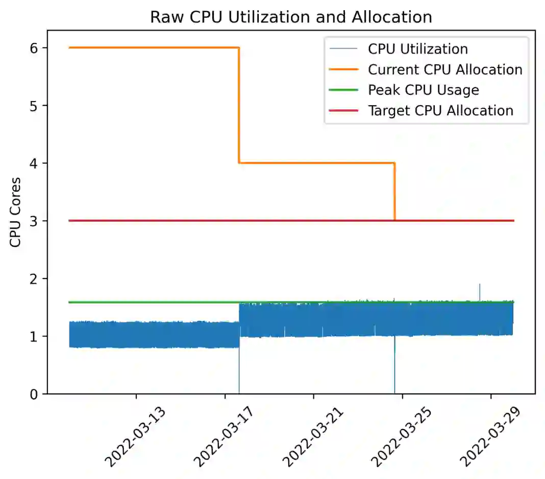 图 2:展示了存储容器的 CPU 利用率(蓝色)、整个期间测量的峰值利用率(绿色)、当前分配(橙色)和要达到的最佳分配(红色)。在数周的时间内,扩缩器在几周内逐渐将分配收敛到最优值。