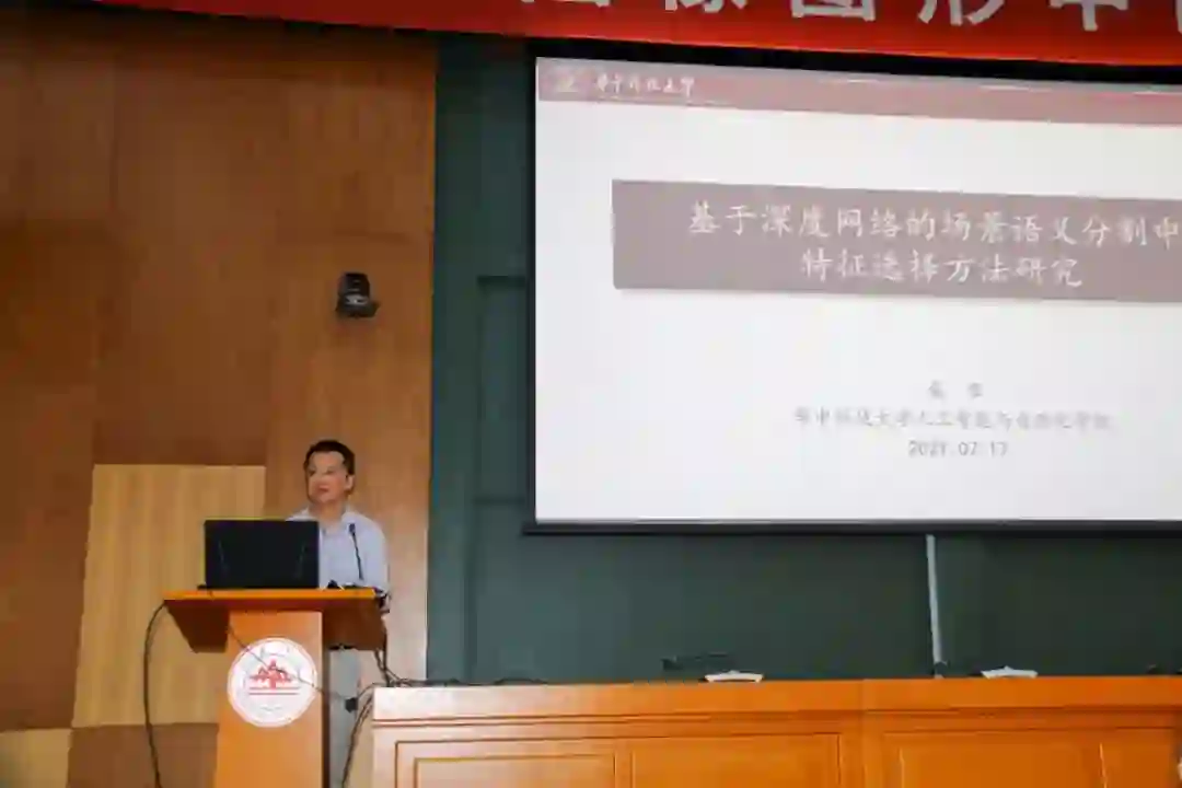 来自华中科技大学的桑农教授带来的报告题目为“基于深度网络的场景语义分割中特征选择方法研究”。报告以场景语义分割中的判别特征感知为研究对象,从特征选择的角度介绍如何增强特征判别性,进而准确高效地建模场景关系、分割场景要素,解决现有算法在特征选择、速度精度平衡上的问题。桑教授详细介绍了隐式引导特征选择和显式引导特征选择两种方案。