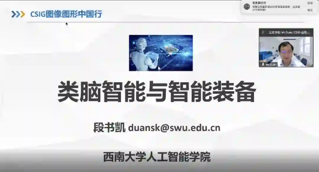 来自西南大学的段书凯教授首先作了题目为“智能算法与类脑芯片”的报告。报告指出类脑计算借鉴人脑信息处理方式,适用于实时处理非结构化信息、具有自主学习能力的超低功耗新型计算系统,它将在各个领域极大地拓展人类的智力活动范畴。报告介绍了类脑计算的最新科研成果,包括应用于多个领域的一系列深度学习算法、多款忆阻器原型芯片以及智能机器人汽车智能制造装备等。