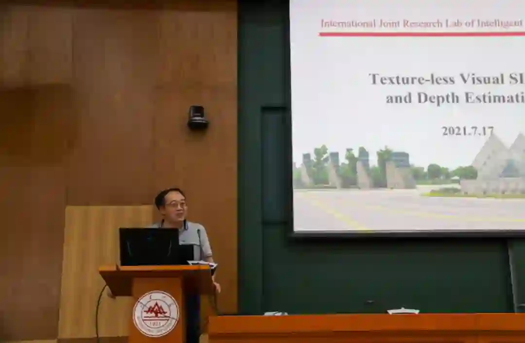 来自上海工程技术大学的方志军教授作了题为“弱纹理视觉 SLAM与深度图估计技术” 的报告。报告主要针对视觉 SLAM 技术在弱纹理和光照变化环境中性能将急剧下降的相关问题。方教授提出了基于线特征的 RGB-D视觉里程计方法以及光度变换网络(PTNet),有效地解决了弱纹理下点特征提取与失效的问题以及直接法中光照剧烈变化的问题。
