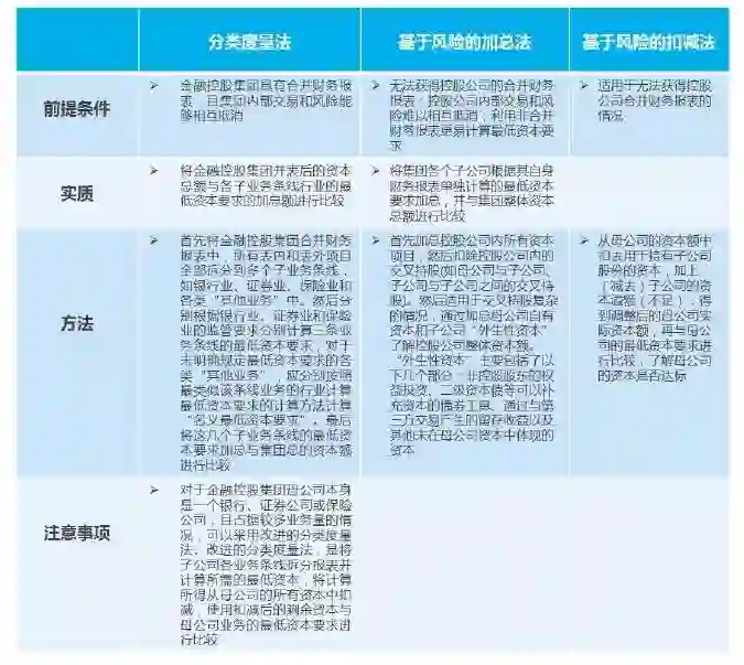 • 统一金控集团的资本构成与扣减标准,实施资本并表计算与监管 • 借鉴《金融集团监管原则》或《多元化金融集团监管的最终文件》中建议的资本充足率度量方法 |