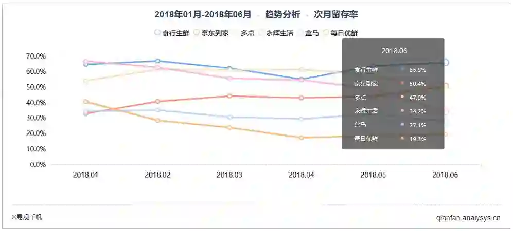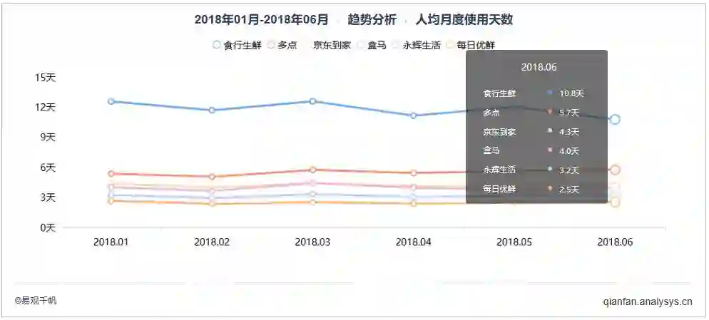 从用户粘性方面看,食行生鲜次月留存率2018年1月—6月一直维持在50%以上,人均月度使用天数1月—6月一直维持在10天左右,这说明食行生鲜用户复购率很高,并在购买上呈现出高频的特点。