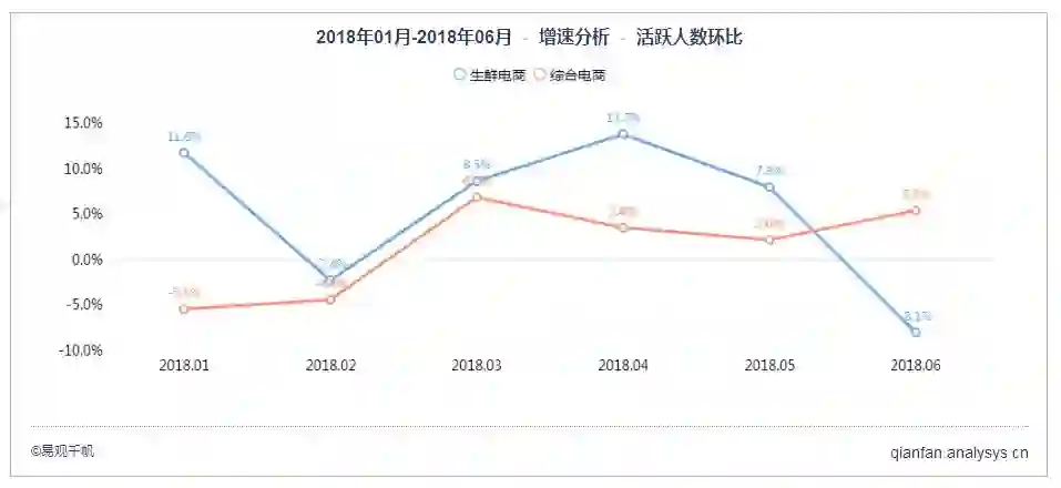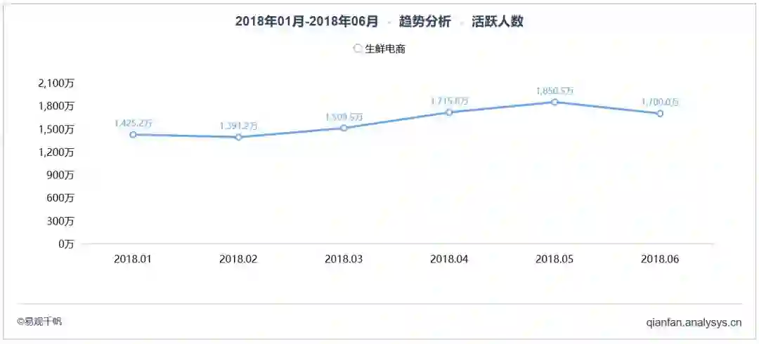 6月进入电商促销月,又适逢“端午节”撞期“世界杯”,各大生鲜电商平台高举“促销”大旗,期望进一步打开市场局面。但是从整体活跃人数表现看,生鲜电商增长未达预期,从5月的1850.5万反降至1700万,环比增幅下降8.1%。