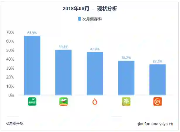 2018年6月生鲜电商App TOP15榜单中,多点连续6个月增长,以757.98万活跃用户规模位于生鲜榜单首位,而每日优鲜、京东到家分别以332.49万和226.15万活跃用户位居二、三位,但环比增幅均有所下降。从用户粘性看,食行生鲜、京东到家、多点位列次月留存率三甲。