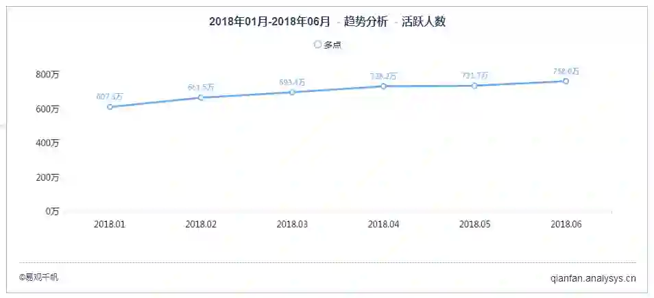 6月,多点Dmall与河南省裕隆时代百货有限公司达成战略合作。自2016年多点Dmall和物美进行战略合作,跑通基于对传统连锁商超的会员、支付、商品等多个环节的数字化改造这一商业模式后,就一路高歌,现已与银川新百集团、武汉新百、邯郸美食林、山东圣豪集团等多家地方性零售巨头达成合作。根据易观千帆数据显示,从2018年1月到6月,多点用户活跃规模一直维持稳定增长态势。