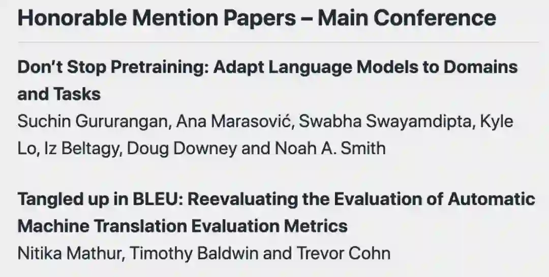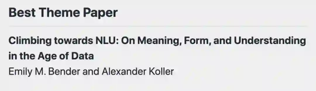 除了最佳论文、最佳主题论文和最佳 Demo 论文之外,ACL 2020 还公布了时间检验奖、终身成就奖,以及杰出服务奖。