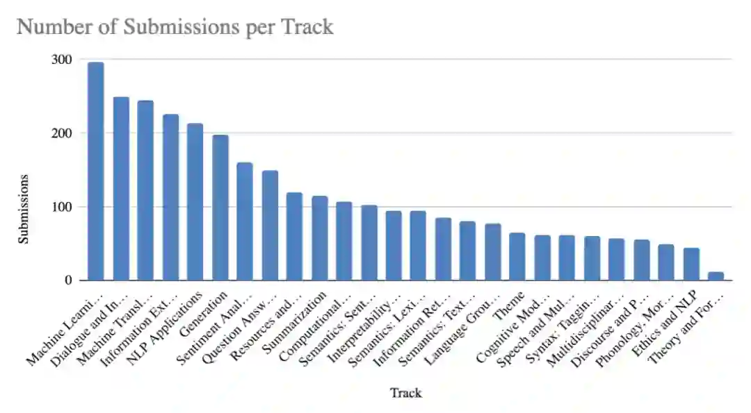用于 NLP 的机器学习、对话与交互技术、机器翻译、信息提取和 NLP 应用是此次会议最热门的 5 个研究主题,每个都有超过 200 篇论文投稿。其中「用于 NLP 的机器学习」主题的论文投稿接近 300 篇(296)。