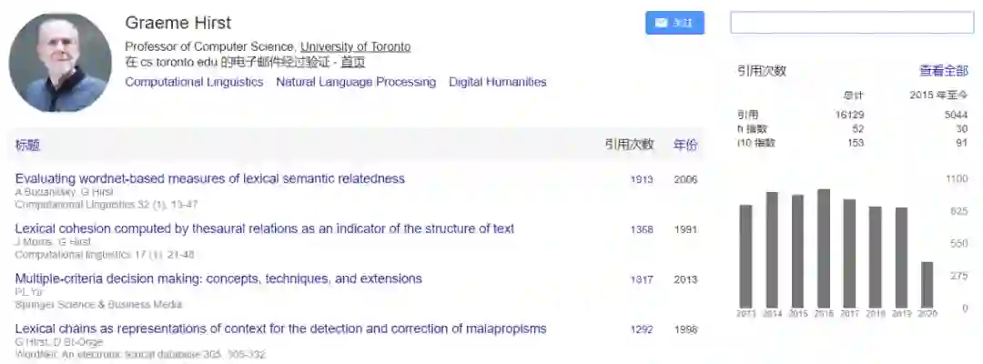 此外,Graeme Hirst 于 2004-05 年担任 ACL 北美分会的主席,2008-2017 年担任 ACL 财务主管,并于 2019 年成为 ACL Fellow。