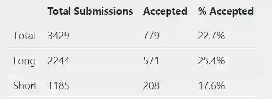 ACL 2020 共收到投稿 3429 篇,创下了 ACL 投稿数量的新纪录。此次会议共接收论文 779 篇,包括 571 篇长论文和 208 篇短论文,论文接收率为 22.7%。