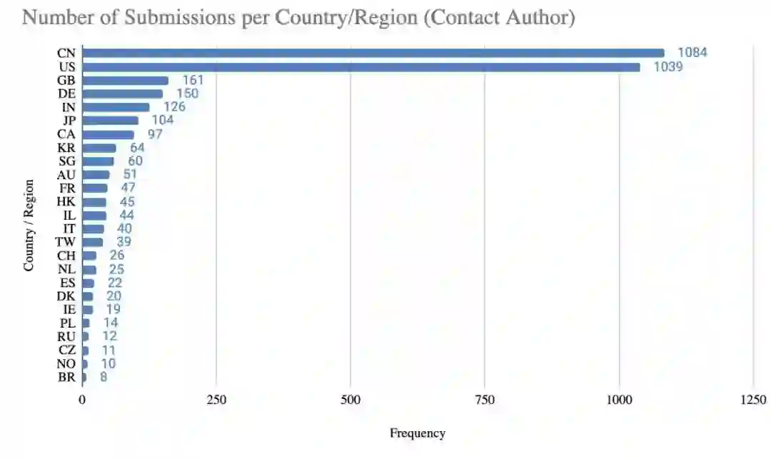 此外,大会公布了论文提交数量最多的 25 个国家或地区,中国大陆以 1084 篇的提交量位列第一,其次是美国。