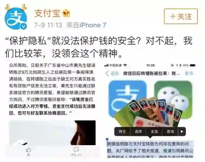 据新浪科技 7月9日,就微信转账与支付宝转账为何存在差异的问题,央广网引用腾讯公关部相关人员的回应表示:微信与支付宝两款产品的基因不一样,设计产品的出发点不同,不能简单对比。支付宝是基于电商,基于交易的,我们本身是一个社交的平台,对用户的隐私保护更严格,大家使用的频率更高。