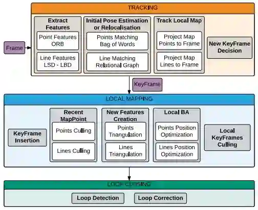 在局部建图线程中,不能从至少三个视角被观测到或者在25%的关键帧中为不可见的线段,会被判定为异常值,从而被剔除。进而,对线段特征进行三角化,并融入局部地图中。最后运用局部BA方法对点线特征进行优化。