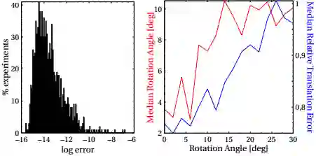 我们创建多项式解算器并评估其稳定性,图2中左图展示了参数估计的分布误差,结果显示平均误差大多集中在1e-15附近,这说明我们的解算器是比较稳定的。此外,我们已经假设相机在连续三个帧之间的旋转运动是很小和连续的,图2中右图显示,旋转和平移误差会随着帧之间的旋转的增加而增大,并且当旋转估计误差在一定小的范围内,小旋转运动的假设对平移误差的影响是很剧烈的。但不管怎样,只要初始化地图被引入了BA优化器,则平移误差就会急剧下降。