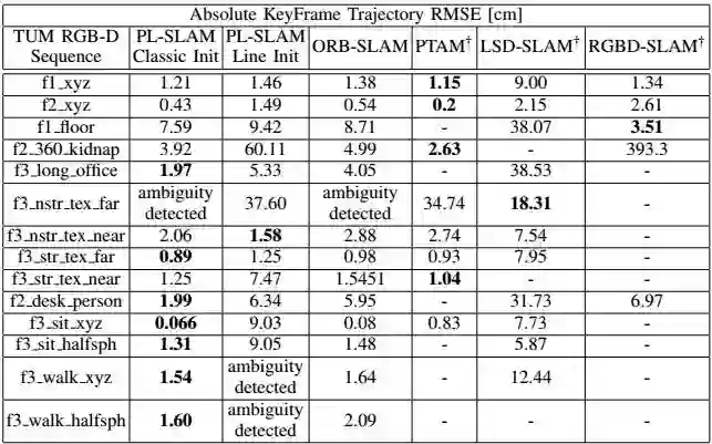 如表1所示,在基于TUM RGB-D数据集的实验中,由于小旋转运动的假设,线段地图的初始化失效了,但是在弱纹理序列f3 nstr tex far中,我们的方法能够得到初始化地图,优于其他方法。