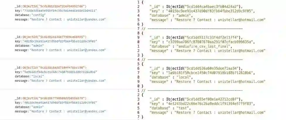 Jain 表示:“鉴于目前 BinaryEdge 对 63000 多台可公开访问的 MongoDB 服务器进行了索引,Unistellar 攻击者似乎已经减少了大约 20%。”4 月 24 日,研究人员第一次发现了被删除的 MongoDB 数据库,攻击者留下了一条信息:“想要恢复数据库吗?请联系:unistellar@yandex.com。”