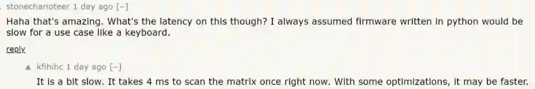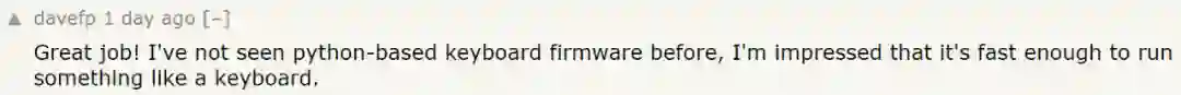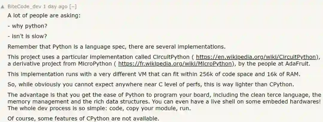 ta 指出,这个项目用到的 CircuitPython 实现使用一个非常不同的 VM 运行,虽然不能指望它接近 C 的性能,但相比 Cpython 要轻量化得多。
