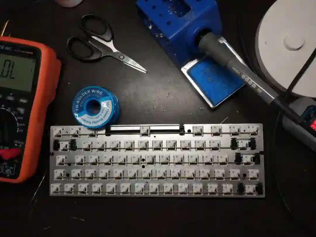 去掉键盘帽扣,作者用焊丝把关联按键连接起来,达到下图这样的效果。